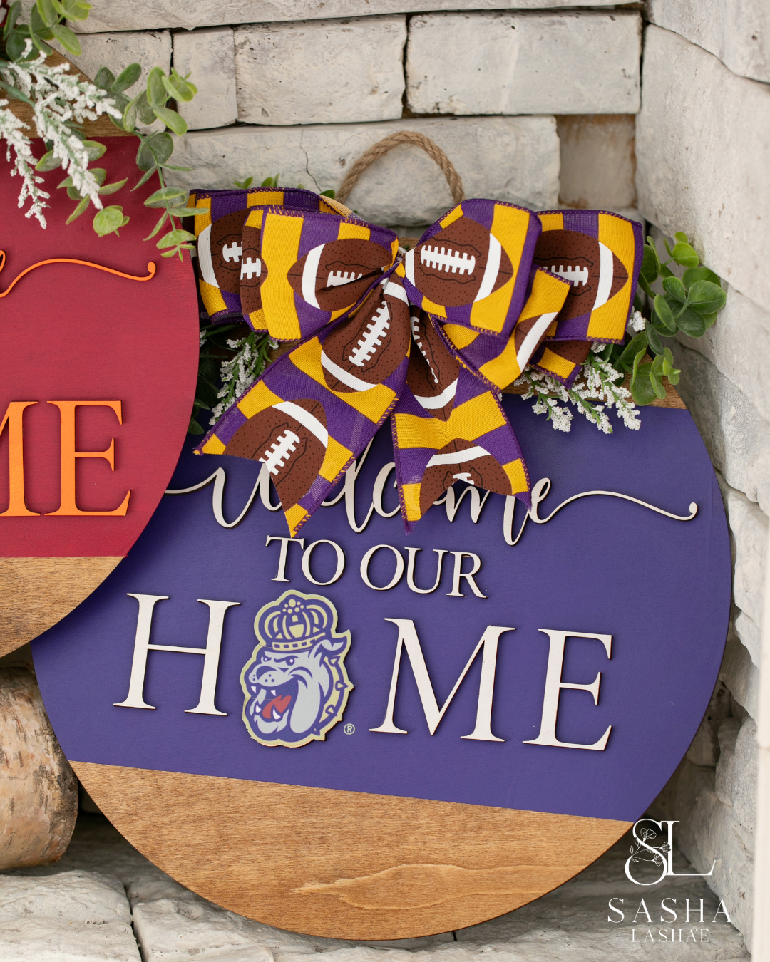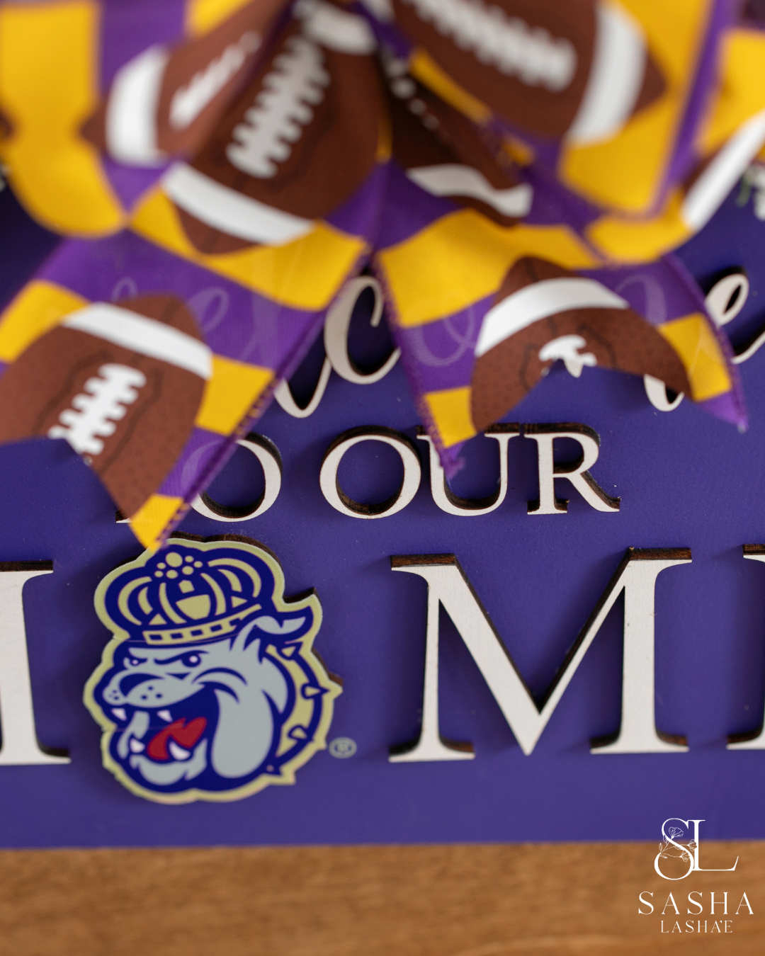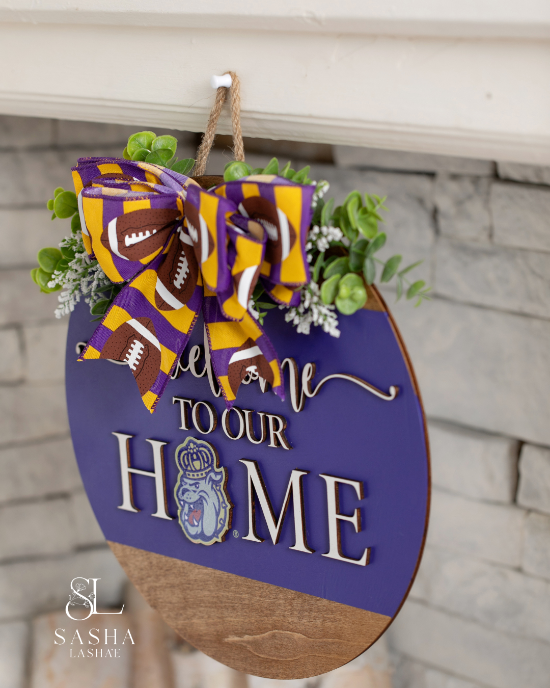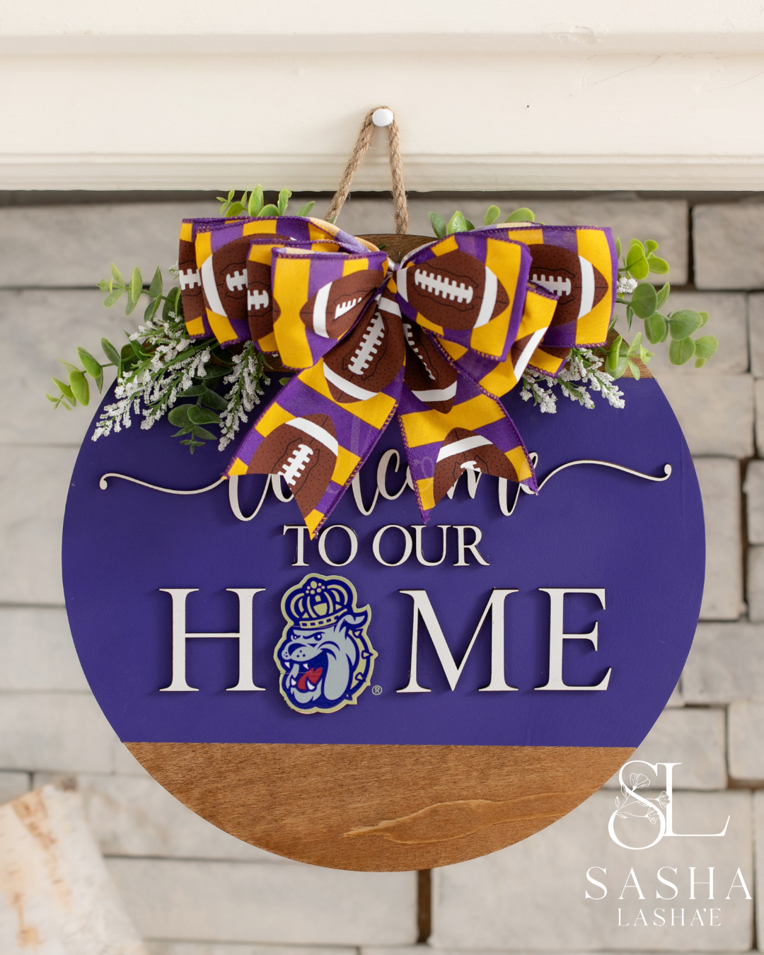 Welcome guests to your home with a bold statement of school pride with our "Welcome to Our Home" sign, where the 'O' in "home" is replaced by the iconic JMU mascot logo. This stylish sign is designed to showcase your love for James Madison University, combining a warm welcome with spirited school pride. Made from durable materials, it's perfect for both indoor and outdoor display, making it a great addition to your front door, entryway, or living space. Whether you're a student, alumni, or proud supporter, this sign adds a personal touch of Dukes spirit to your home decor.