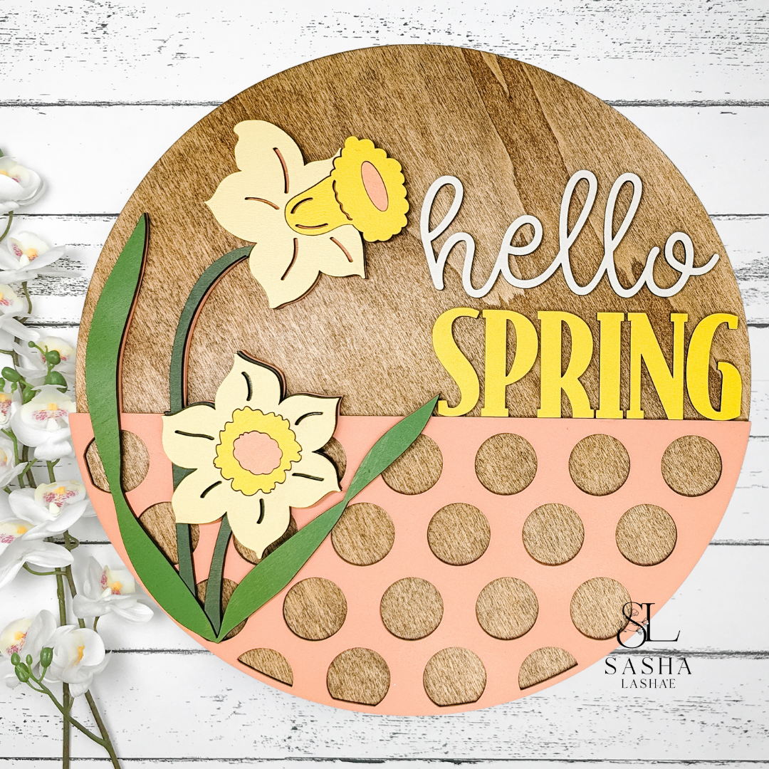 Welcome the season of renewal and blooms with our "Hello Spring Daffodil" sign. Crafted with care and attention to detail, this charming sign features a cheerful daffodil design that brings a touch of springtime joy to your home. Whether hung on your front door to greet guests or displayed indoors as a seasonal accent, it's sure to brighten up any space. Made from high-quality materials, this sign is durable and designed to celebrate the beauty of spring in style.
