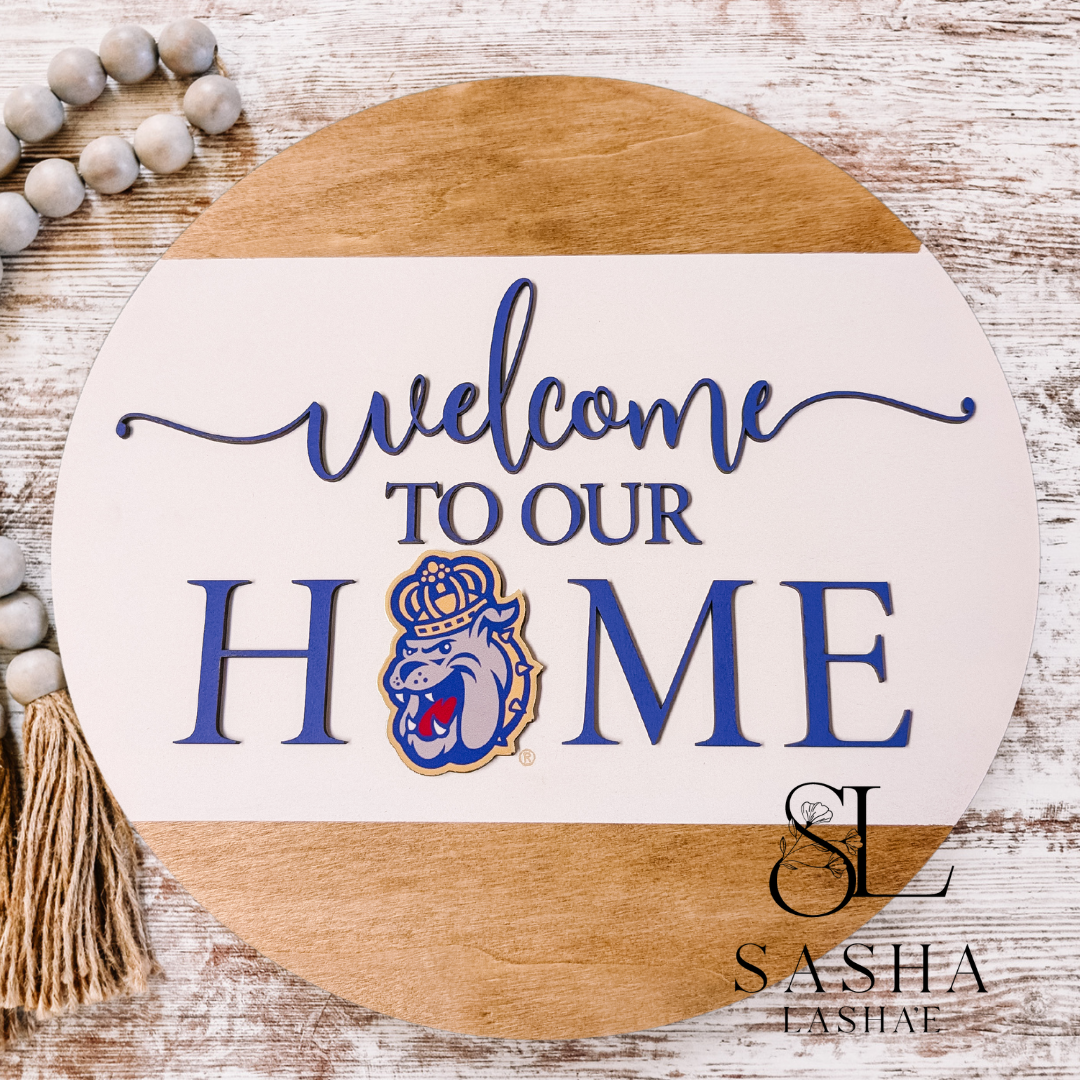 Welcome guests to your home with a bold statement of school pride with our "Welcome to Our Home" sign, where the 'O' in "home" is replaced by the iconic JMU mascot logo. This stylish sign is designed to showcase your love for James Madison University, combining a warm welcome with spirited school pride. Made from durable materials, it's perfect for both indoor and outdoor display, making it a great addition to your front door, entryway, or living space. Whether you're a student, alumni, or proud supporter, this sign adds a personal touch of Dukes spirit to your home decor.