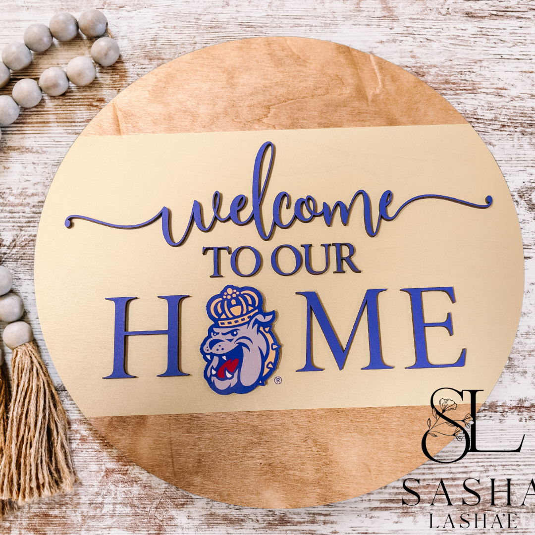 Welcome guests to your home with a bold statement of school pride with our "Welcome to Our Home" sign, where the 'O' in "home" is replaced by the iconic JMU mascot logo. This stylish sign is designed to showcase your love for James Madison University, combining a warm welcome with spirited school pride. Made from durable materials, it's perfect for both indoor and outdoor display, making it a great addition to your front door, entryway, or living space. Whether you're a student, alumni, or proud supporter, this sign adds a personal touch of Dukes spirit to your home decor.